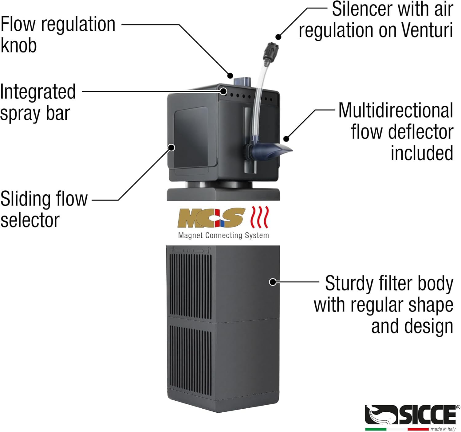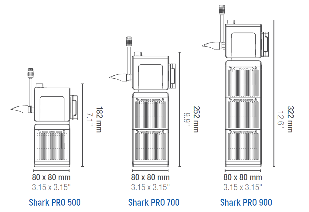 Los filtros SHARK PRO vienen con un diseño modular y flexible. El filtro se puede utilizar horizontal y verticalmente. El exclusivo sistema magnético de desacoplamiento rápido de Sicce permite una operación de mantenimiento más sencilla. Los filtros cuentan con un sistema de aireación integrado y una barra rociadora.