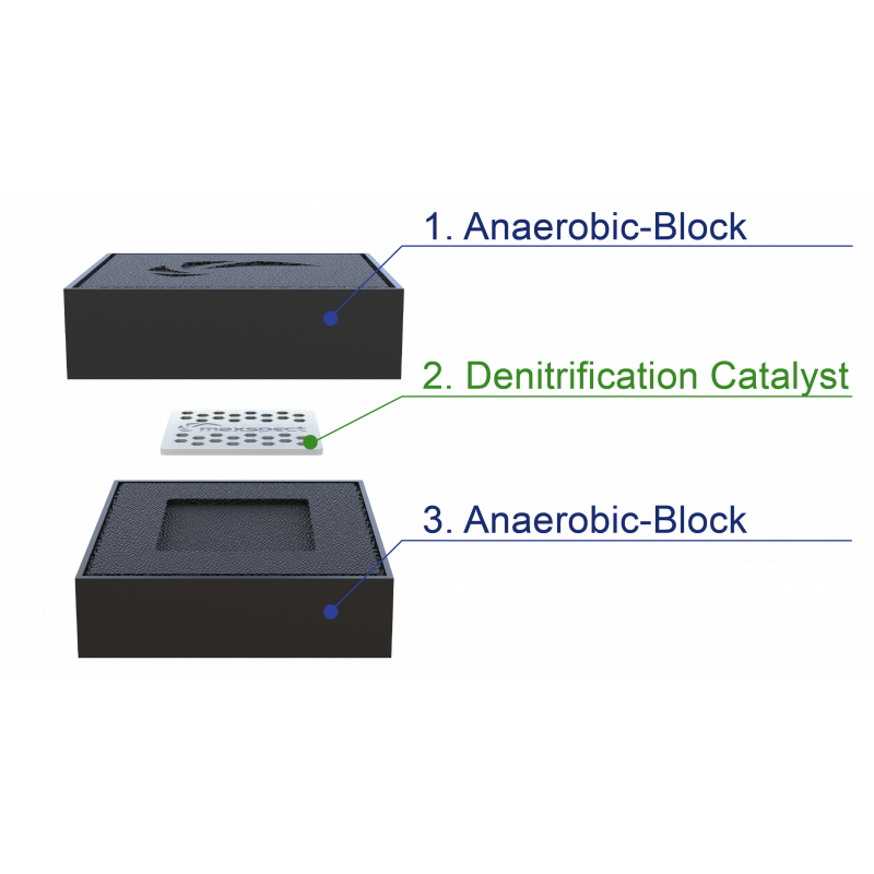 Utilícelo directamente en el sumidero, apile dos bloques anaeróbicos horizontalmente y coloque un catalizador de desnitrificación entre los bloques, como se ilustra arriba. El catalizador de desnitrificación se agotará lentamente y deberá ser reemplazado cada 2 meses.